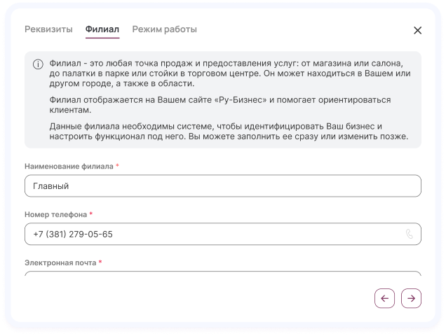 Если Вы регистрируетесь как физическое лицо - заполните пункт Дополнительно, где нужно ввести реквизиты компании: ИНН и фактический адрес, контактные данные и адрес филиалов, а также время работы. Эти данные необходимы при работе с документами Вашей организации.