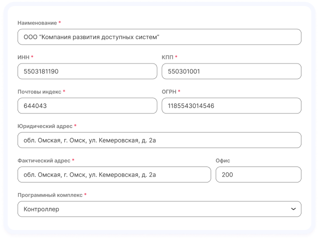 Если Вы регистрируетесь как юридическое лицо - вторым обязательным шагом будет заполнение информации об организации, где нужно ввести реквизиты компании: ИНН, фактический и юридический адреса с индексом, КПП, ОГРН.