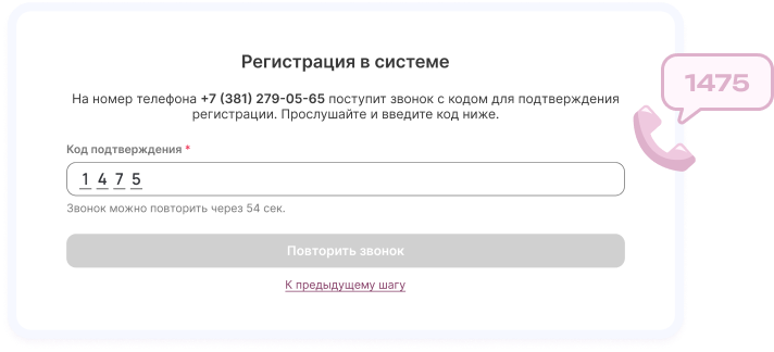 На Ваш номер телефона поступит звонок с кодом. Прослушайте и введите его в строку подтверждения регистрации.